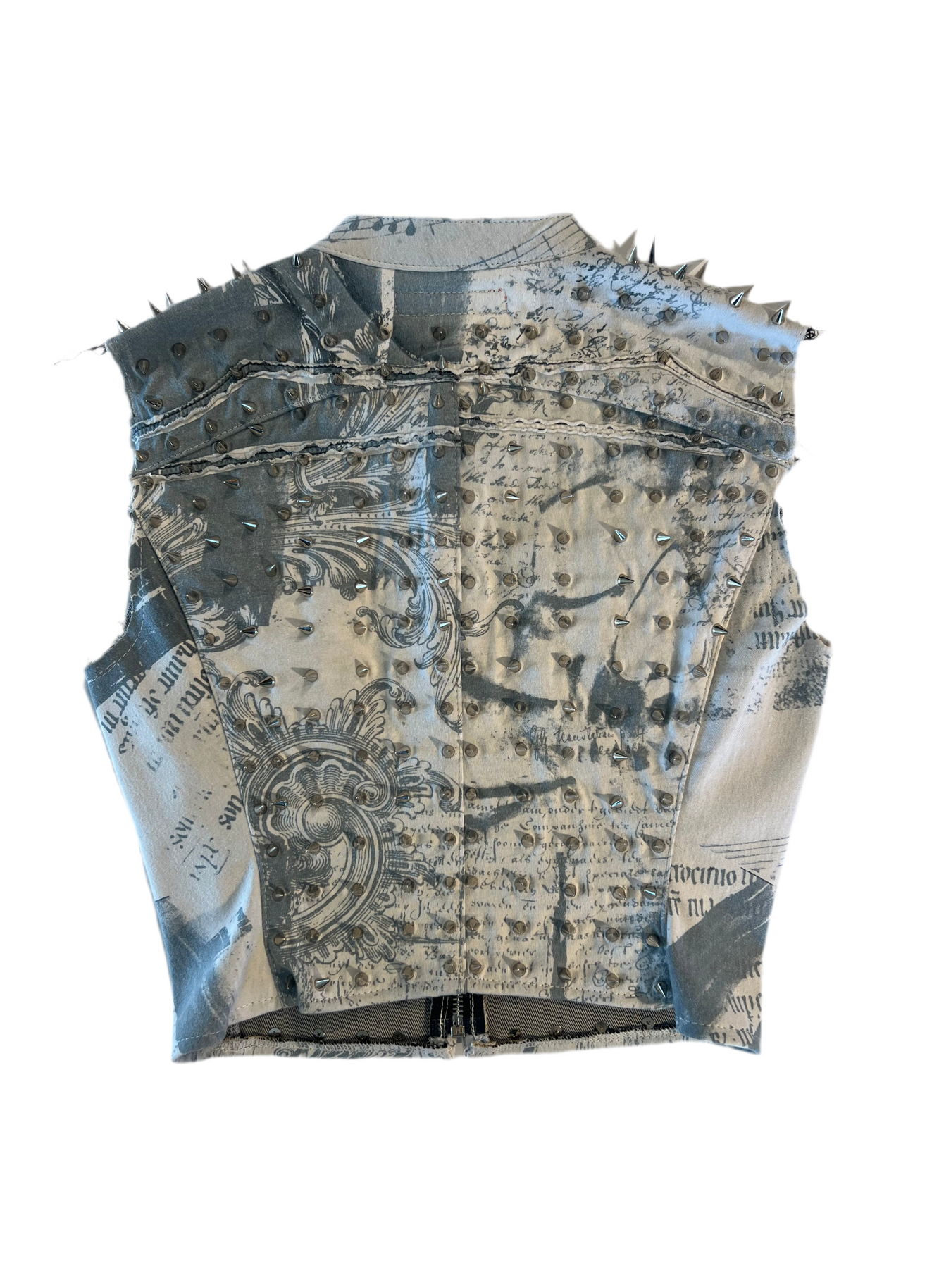 Upcycled Moto Jacket inspired from the Jigsaw horror character. Constructed using a vintage Y2K shirt and features over 200+  hand placed spikes.